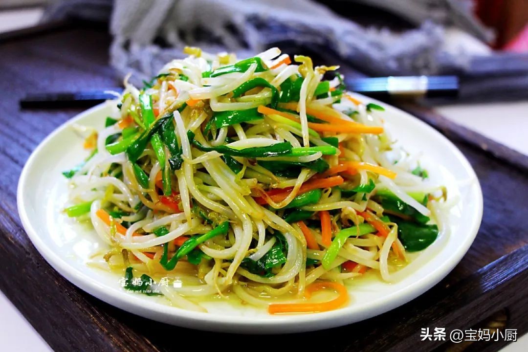 3,绿豆芽打蔫断生,放入韭菜翻炒几下,加盐,韭菜一打蔫就关火出锅。几分钟的事儿,这道菜就做好了,清爽开胃。