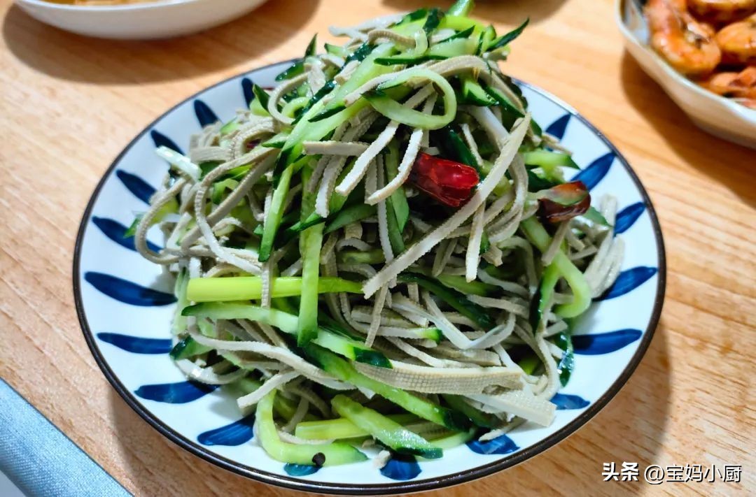 现成的五香干豆腐丝,切上一根黄瓜一拌,味道好极了。这道菜,干豆腐丝要想更好吃,没那么咸,需要用水冲洗一下再用