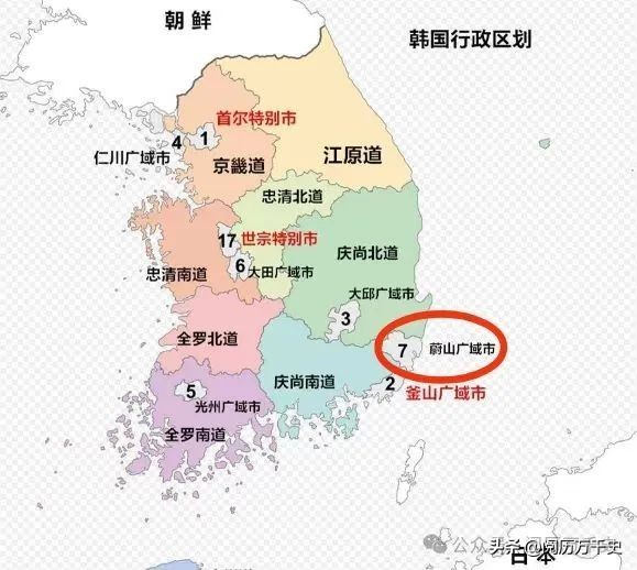1997年7月15日设立蔚山广域市,下辖4区1郡,分别是:北区、东区、中区、南区和蔚州郡。