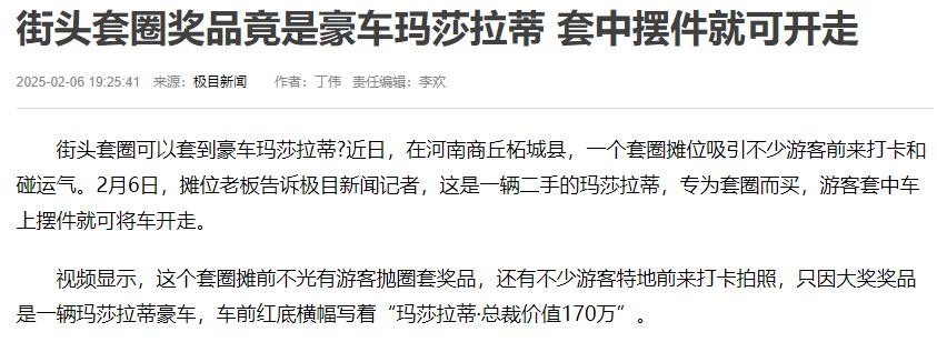 参考信源:街头套圈奖品竟是豪车玛莎拉蒂 套中摆件就可开走--2025-02-06--来源:极目新闻