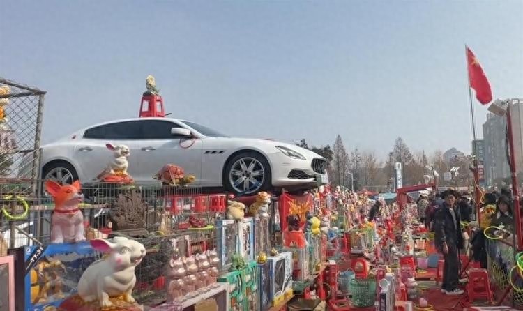 这样一来,所有路过的人都能看到这辆豪车,吸引力十足,而且除了玛莎拉蒂,摊位上还有各种奖品,比如孩子们喜欢的玩具,活羊活牛啥的,应有尽有。