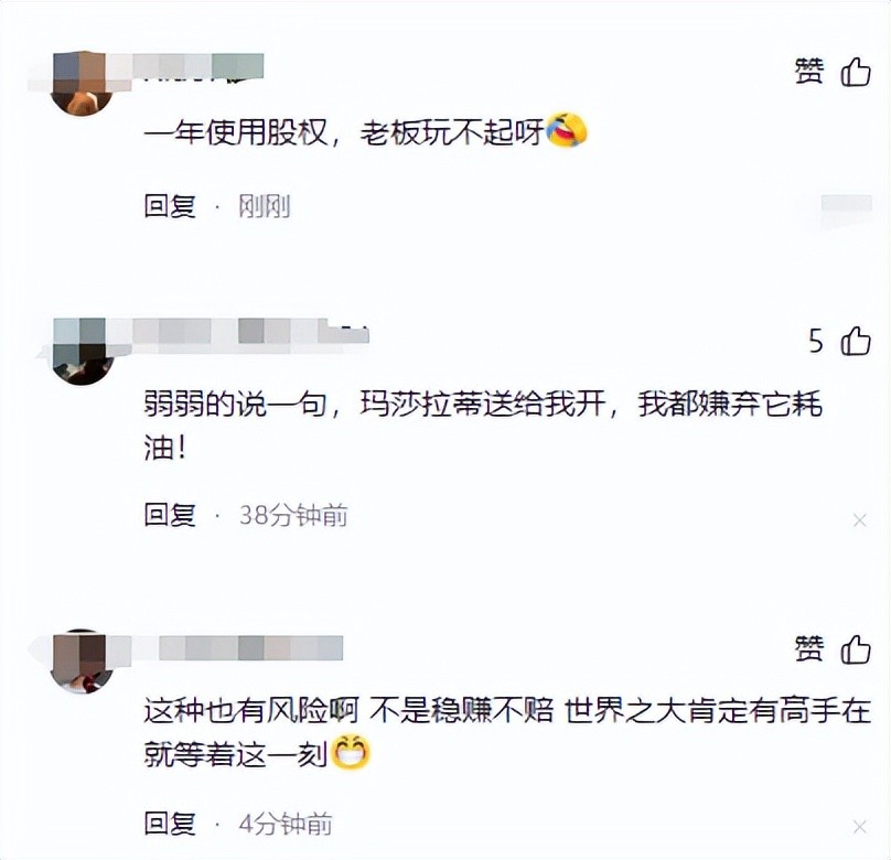 更有网友调侃说,这下老板可要哭晕在厕所了,把玛莎拉蒂当奖品,结果还真被人给套走了,这不是打自己的脸么。