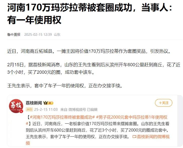 河南170万玛莎拉蒂被套圈成功,当事人:有一年使用权--鲁中晨报---2025-02-15