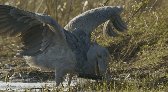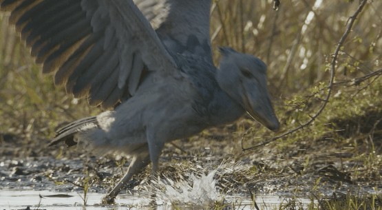 在这个时候,鲸头鹳就会悠闲的走到水边十分茂密的水草边,然后就站在那里一动不动的等待时机。