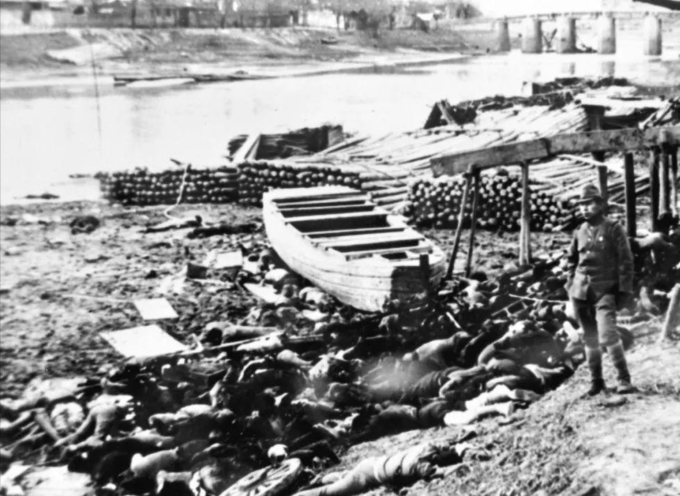 图为在南京城西一条流往长江的小河边,被日本侵略军杀害的中国人,尸体遍地血流成河