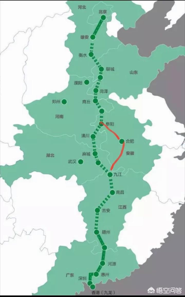 准确的是,目前的西线阜冈九段才是京九高铁的主线,而商丘-合肥段则是面向台北的。不过目前阜冈九线尚未修建,因此东线先修取而代之。