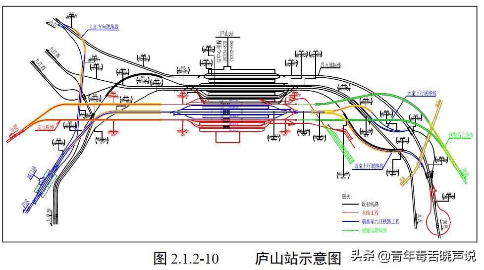 根据庐山站(九江南站)现有情况以及未来铁路发展情况结合考虑,初步规划庐山站(九江南站)站场规模为8台25线。在既有普速场对侧新建客专场,既有普速场进行改建调整,庐山站(九江南站)按照城际场、普速场、客专场三场并列布置进行改建,城际场位置既有2台4线规模不变,普速场规模减小为2台9线,其中2条既有京九铁路正线,3条客车到发线,4条货车到发线。客专场为2台4线(预留京九客专外夹接入),在车站南端设置环线,办理沿江通道车流环形运输作业。