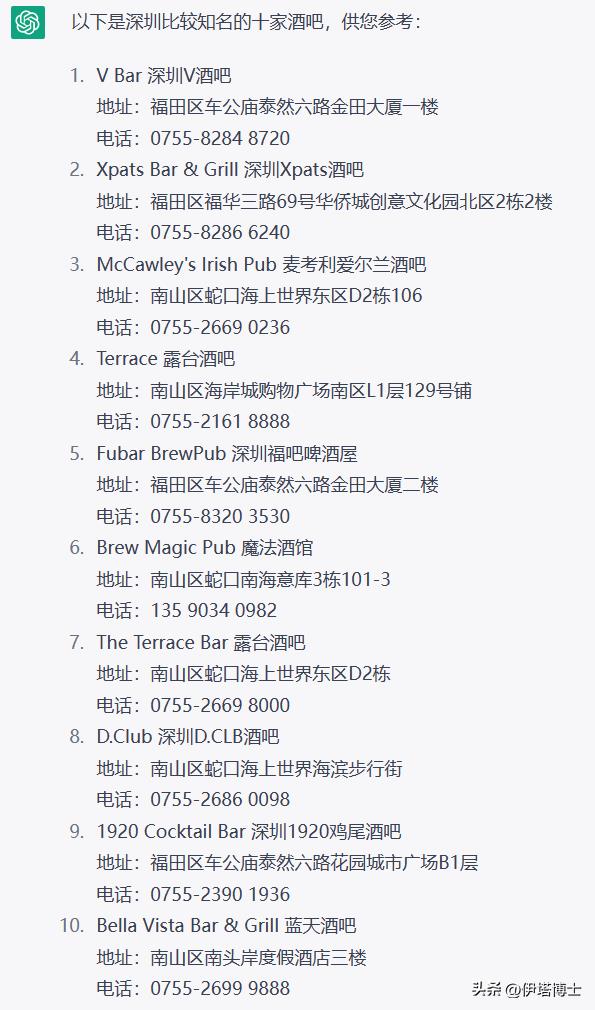 ChatGPT眼中的深圳十大酒吧,列表直接给出来了,但是在大众点评上一搜,好像很多都不存在或者已经歇业了。看来ChatGPT用来替代大众点评还差点意思。