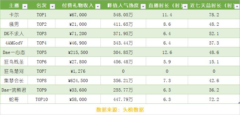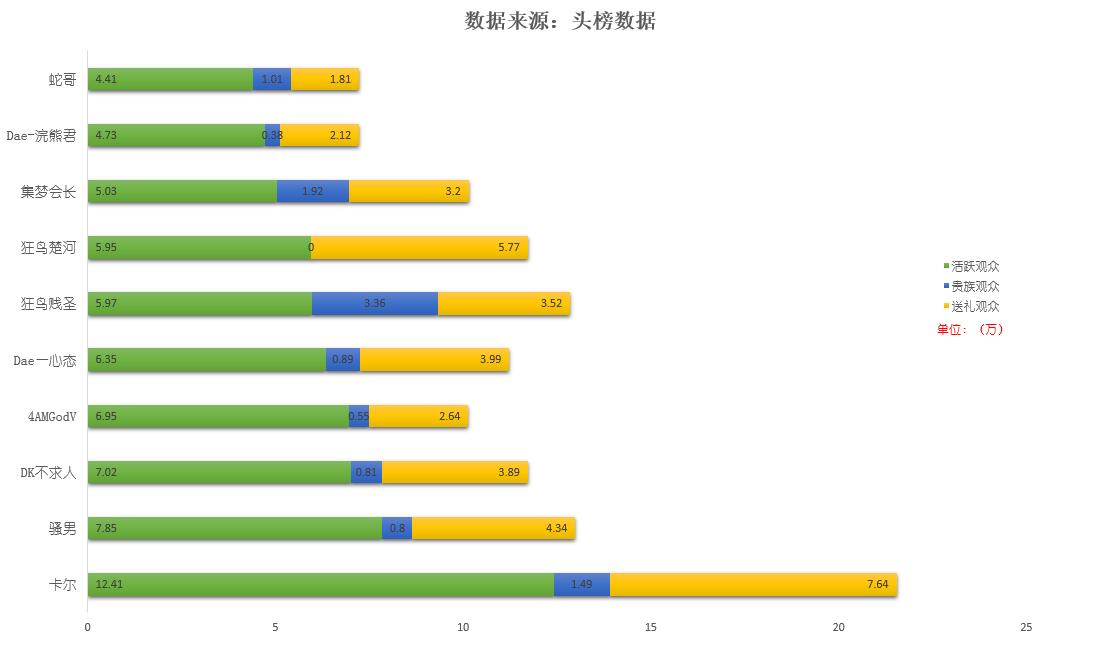 活跃观众由送礼观众构成,而送礼观众中贵族观众成为主播收入的主要贡献来源。在送礼观众数据表现上,虎牙十位主播人均破万(未开播的楚大除外),卡尔7.64万再斩单项数据冠军。主机区的贱圣在贵族观众数据上表现抢眼,以3.36万占据榜首。