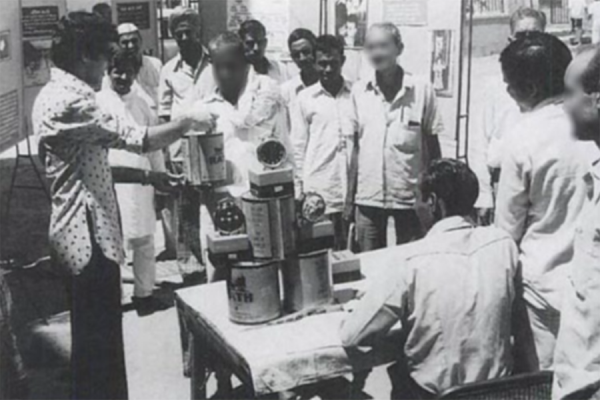 1976年,一处绝育手术站,印度男性排队领取绝育手术赠品。