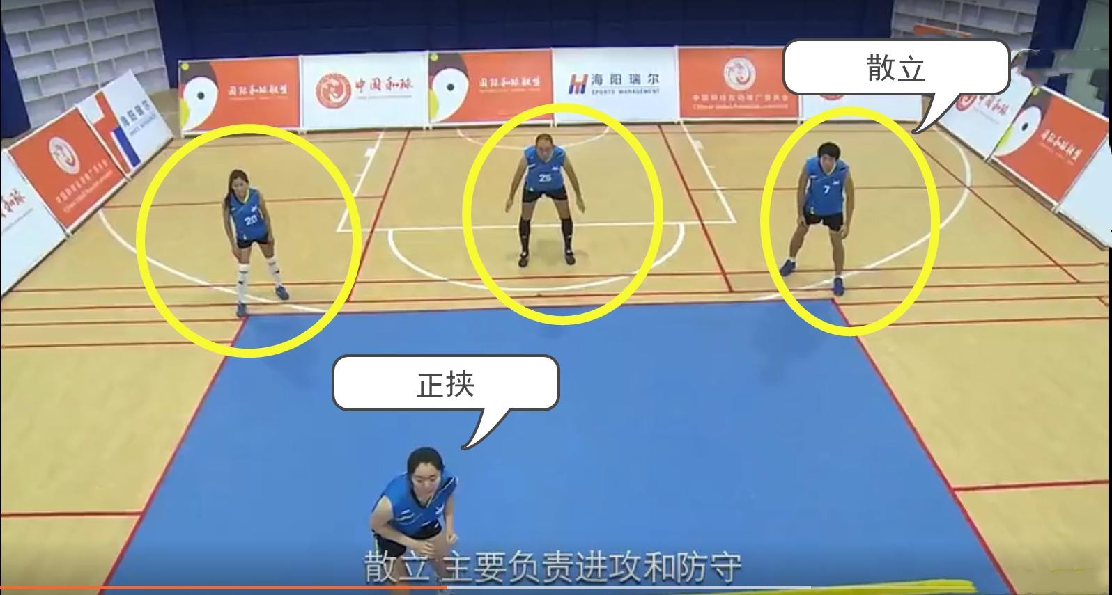 正挟-1人,立于网前,主要负责场上组织,传球等工作