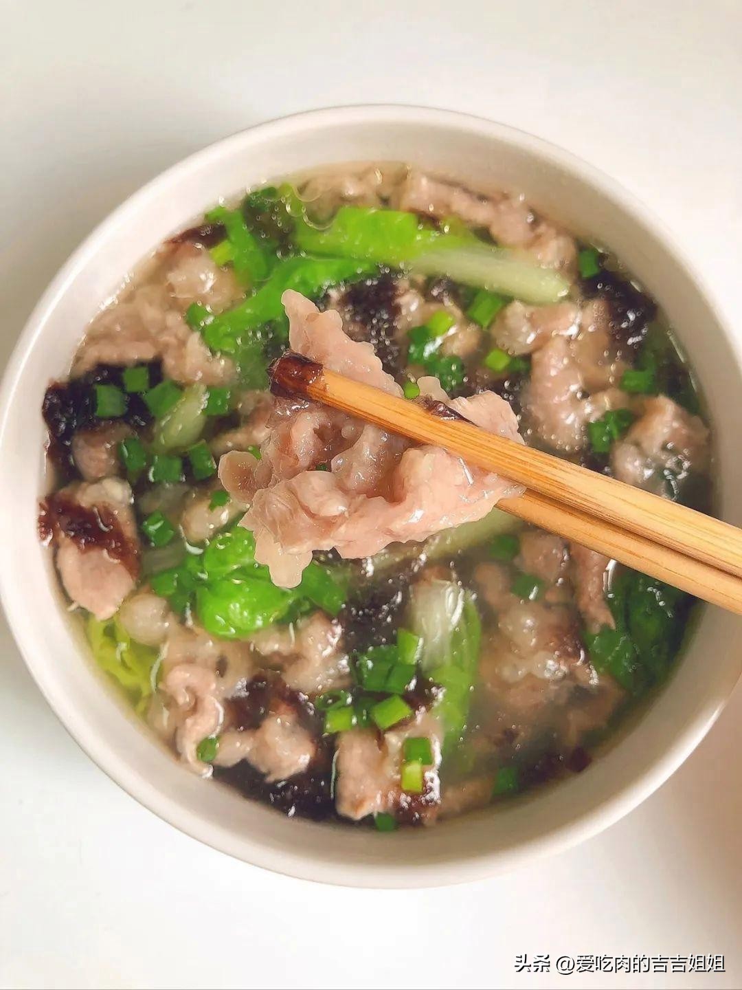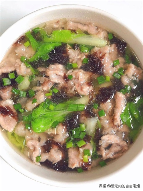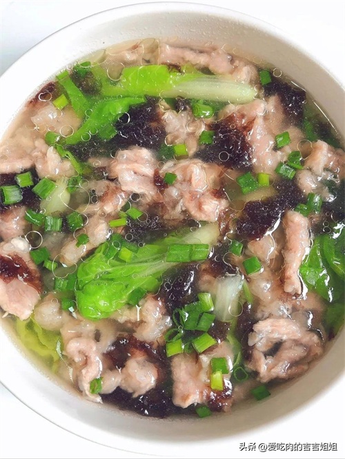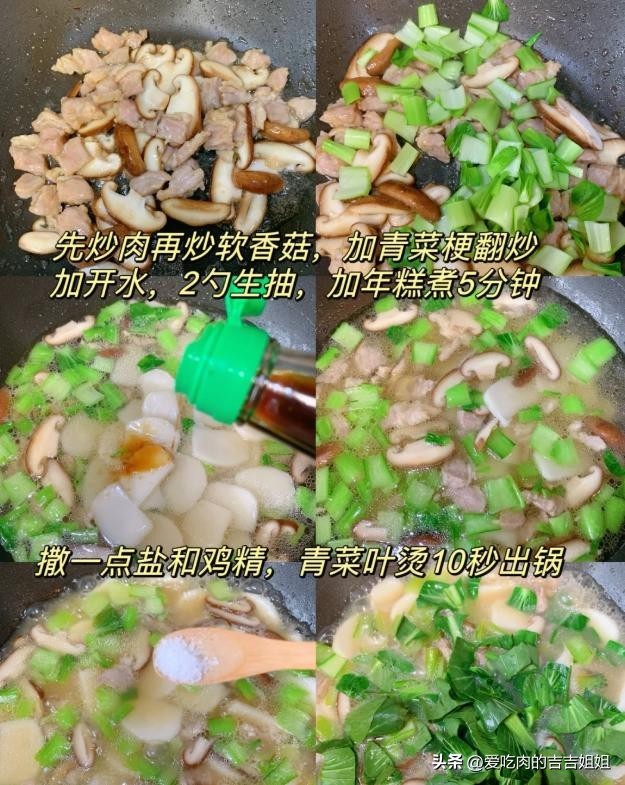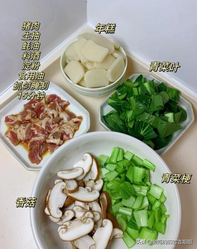 做法步骤: ️肉丝放入碗中,倒入1勺生抽、1勺料酒、少许白胡椒粉、一勺玉米淀粉拌均匀腌制半小时 ️青菜菜切成小段,4朵香菇切片,年糕切片备用 ️锅内倒入适量的油,下肉丝炒至泛白,盛出备用 ️锅内留底油倒入蒜末和姜丝炒香,放入青菜 和香菇翻炒均匀炒软 ️倒入适量的清水,煮开后放入年糕片,加少许盐调味,翻拌均匀煮3分钟,️放入肉丝翻拌均匀,最后撒入少许葱花即可