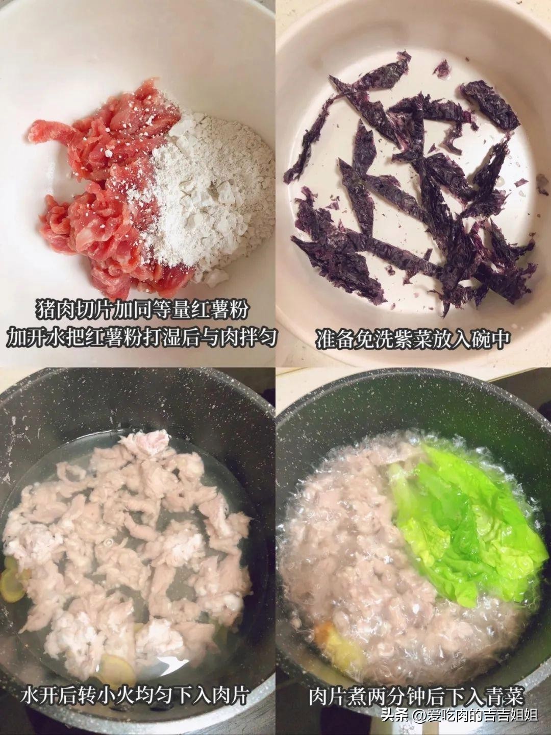1、猪肉切薄片,加同等量的红薯粉,用开水把红薯粉打湿后与肉片拌匀
