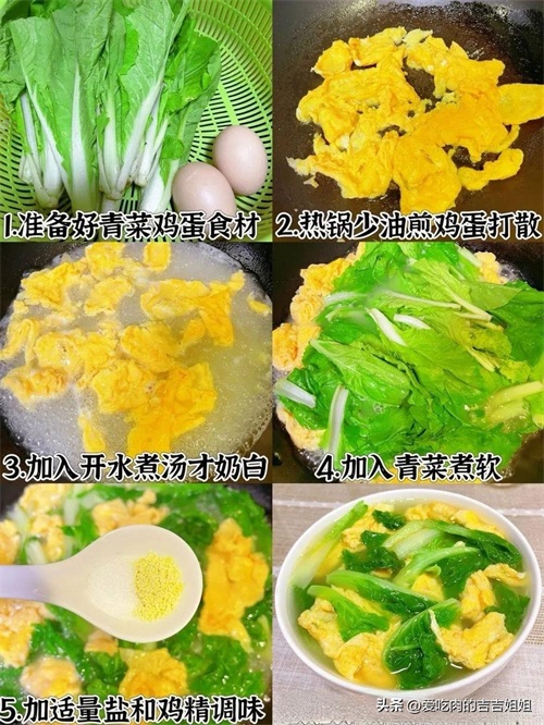 准备好食材洗干净青菜备用; ️热锅少油煎鸡蛋打散; ️加入适量开水煮汤才会奶白; ️放入青菜煮软后加适量盐和鸡精调味即可出锅!