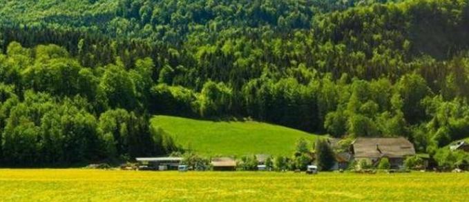 湖区田园风光,卡通味十足的农舍前,一群阿尔卑斯山区特有的西门塔尔牛,悠闲地啃食着牧草。