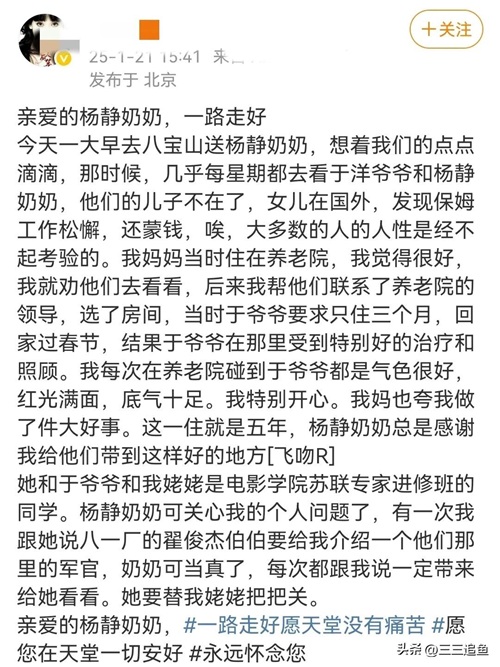 杨静老师离世后,于洋老师也跟着走了,夫妻俩的感情令人动容。