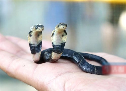 曾经在我国的南宁市动物园的蛇园中,发现了一条长了两个头的中华眼镜蛇(别名又称舟山眼镜蛇),这条双头中华眼镜蛇的两个头是从头部至身体六厘米处是分开的。神奇的是,除了胃等消化系统、生殖系统是共用的以外,它们分别有各自的大脑、心脏、眼睛、舌头等器官。