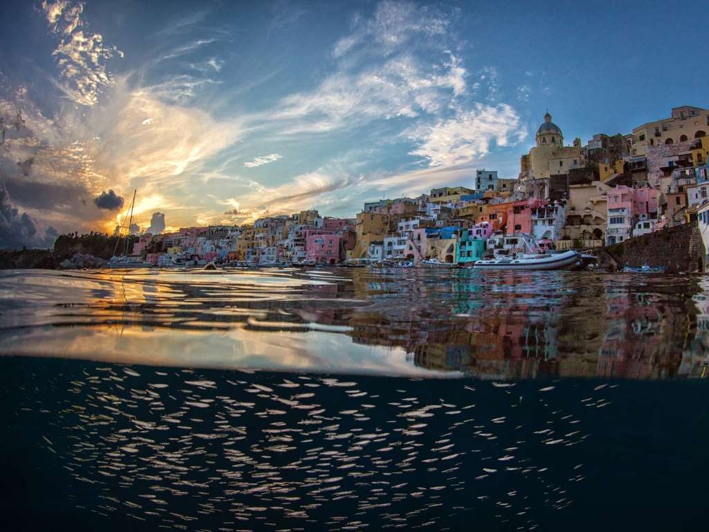 20、意大利,坎帕尼亚州,那不勒斯县,普罗奇达岛提雷尼亚海,从水面眺望傍晚的普罗蒂达。
