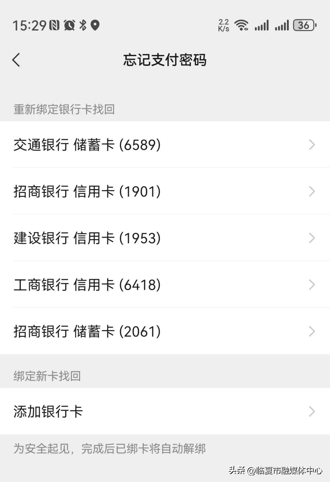 如果你选择的是“验证银行卡信息找回”模式,则会进入一个重新绑定银行卡的页面,并且在这个页面中列出了当前微信已经绑定的银行卡。点击任意一张银行卡进入下一步的操作页面。