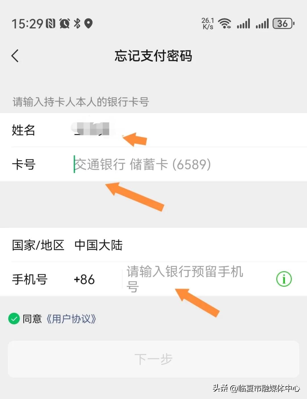 接下来只需根据微信的引导界面输入银行卡的卡号以及办理银行卡时预留在银行的手机号码,然后按照系统的引导操作即可。