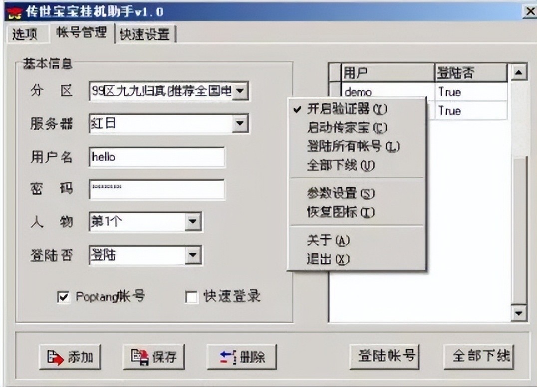 如果说之前的外挂可以形容为游戏的害群之马,破坏游戏平衡,那么传家宝简直可以称之为平民天使!只需要打开它,它就能自己独立生存,不需要你打开游戏,甚至不需要你下载几个G的游戏客户端,只需要下载一个几十M的外挂启动器就可以开始挂机了。甚至你可以不挂机,在外挂里自己手动打怪、拾取物品,更厉害的是它还能与其他玩家聊天、交易!