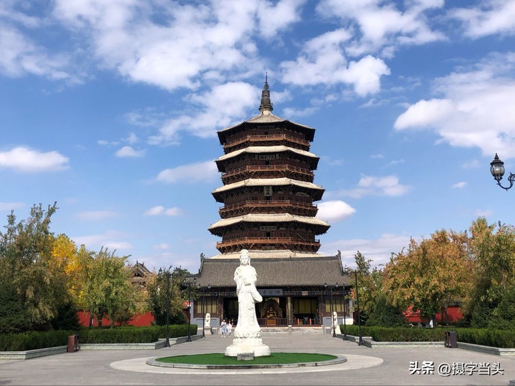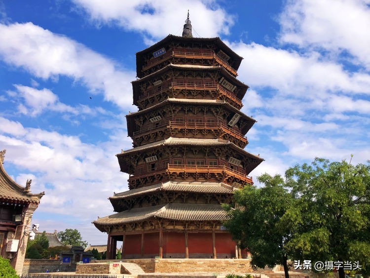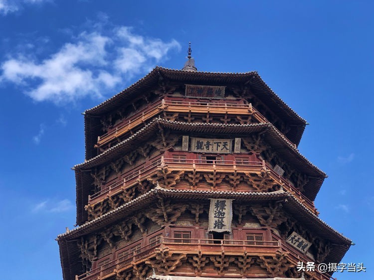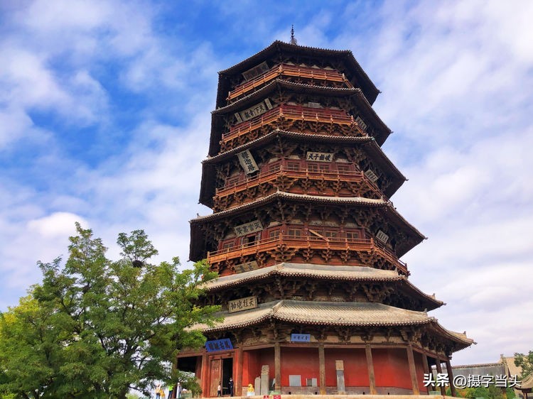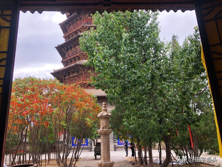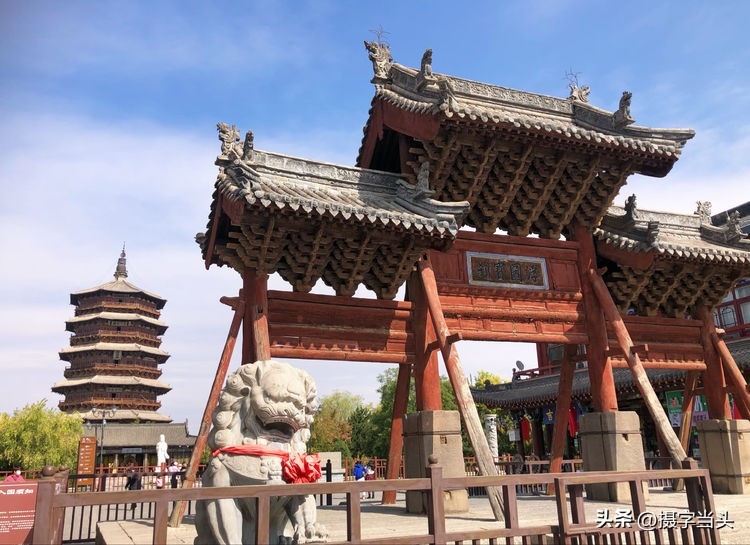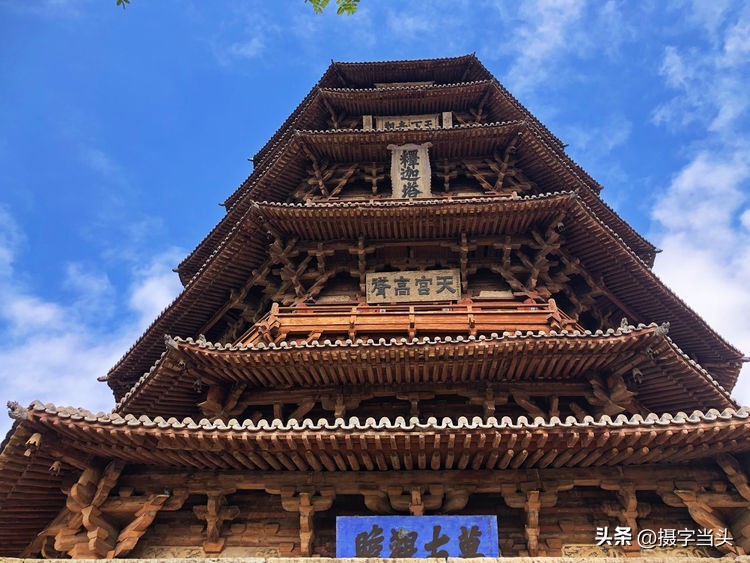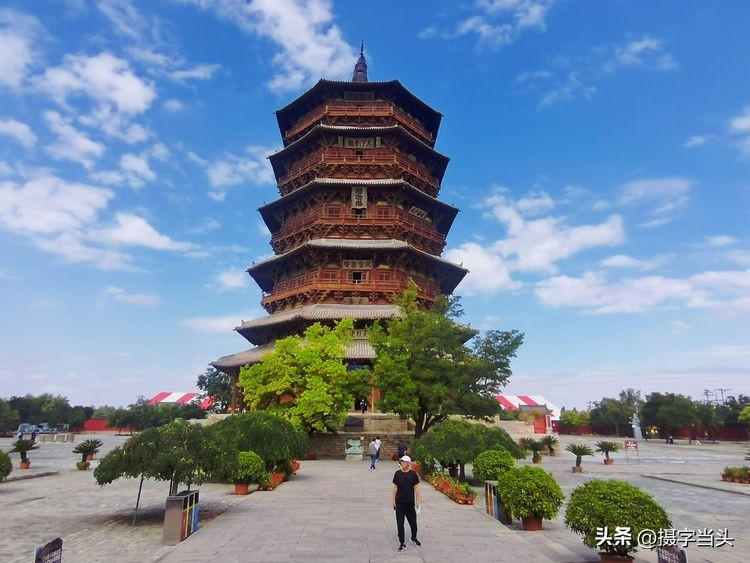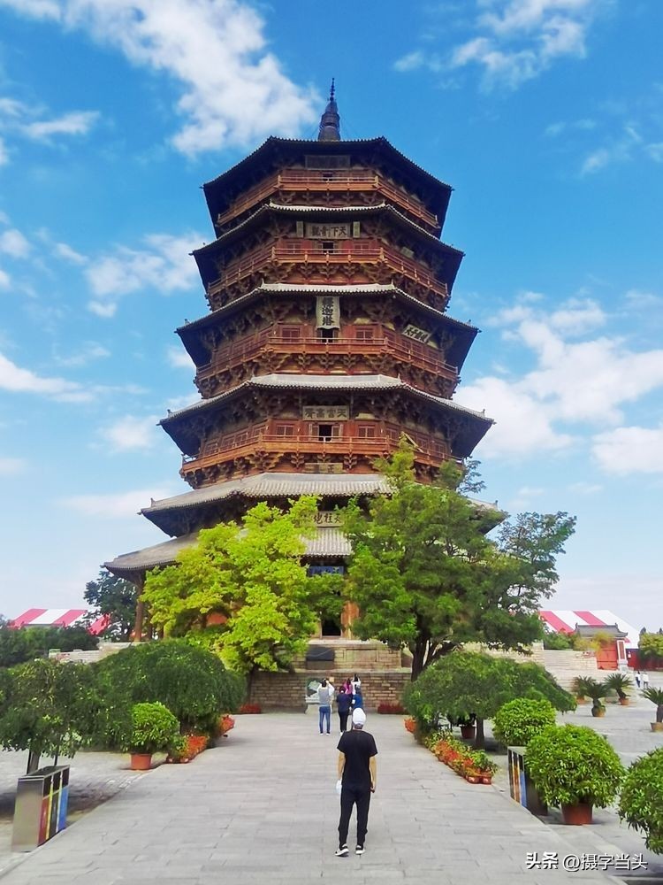 只要一进应县城北,老远就能看见一座古色古香的高塔,纵使被现代建筑包围,依然鹤立鸡群。及到塔下,压迫感扑面而来,仿佛真能“危楼高百尺,手可摘星辰”。
