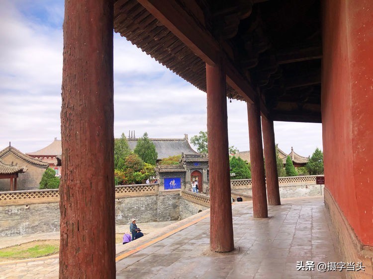 出木塔后门,就是佛宫寺主殿大雄宝殿(俗称九间殿)。大雄宝殿雄伟庄严,不过刚从木塔出来,相比之下,感觉气度上还是相差不少,