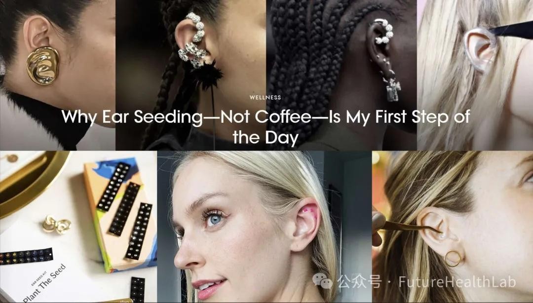 (2)耳穴贴中设计珠宝饰品的效果:我们发现在耳贴材质中并没有去深入区分磁石或药物功效的功能,而是把表层覆盖物进行饰品化设计,多样的色彩,以及使用钻石、黄金等材质,在日常使用中可以和耳环配合,作为一种耳饰配饰,在INS上美国网红使用各种佩带传图,VOGUE杂志把 Ear Seeding 评为一种新的时尚趋势,得到了奇妙的种草效果;
