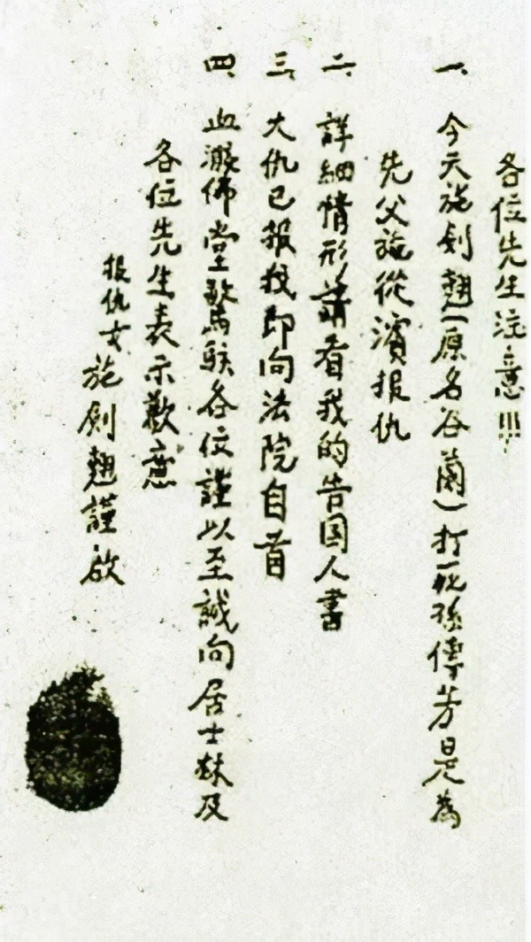 说完,她散发一大把准备好的卡片和《告国人书》及身穿将校服的父亲照片。卡片上写着:各位先生注意:一、今天施剑翘(原名谷兰)打死孙传芳,是为先父施从滨报仇。二、详细情形请看我的告国人书。三、大仇已报,我即向法院自首。四、血溅佛堂,惊骇各位,谨以至诚向居士林及各位先生表示歉意。卡片下署名——报仇女施剑翘和盖有大拇指红印。卡片的背面有两首绝句:父仇未敢片时忘,更痛萱堂两鬓霜。纵怕重伤慈母意,时机不许再延长。不堪回首十年前,物自依然景自迁。常到林中非拜佛,剑翘求死不求仙。