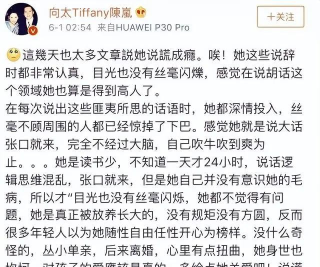 哪怕是曾经将她视如己出的“向太”陈岚,也不留情面的公开发文说她“撒谎成瘾”。