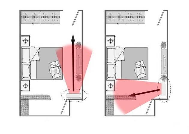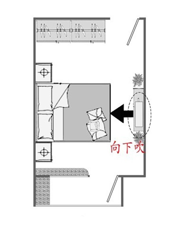 其次是空调在床尾两侧,这时要注意把空调的扇页拨向外边,不要让冷气吹到人身上。