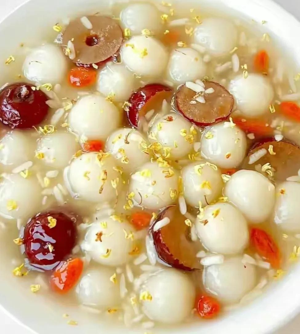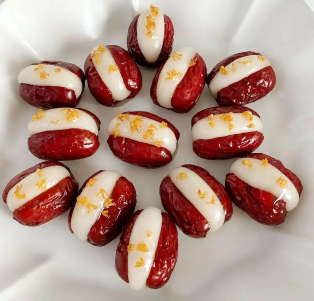 做法:洗净的红枣去核后,中间塞入小汤圆,把红枣放在锅里蒸10多分钟后,撒上桂花糖水就可以了。
