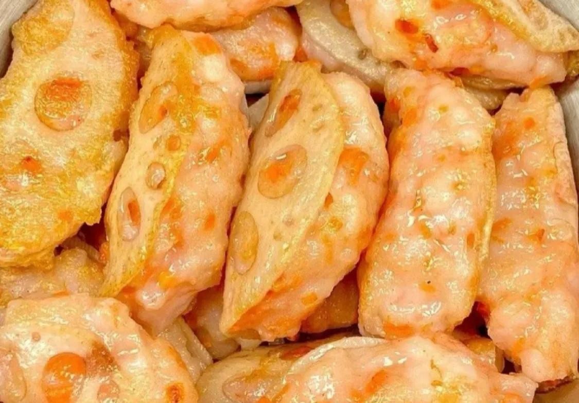 做法:虾滑、胡萝卜、生抽混合在一起,莲藕切片,把虾滑放进莲藕片中,再裹上蛋液,起锅烧热油放藕夹,煎至两面金黄后捞出。