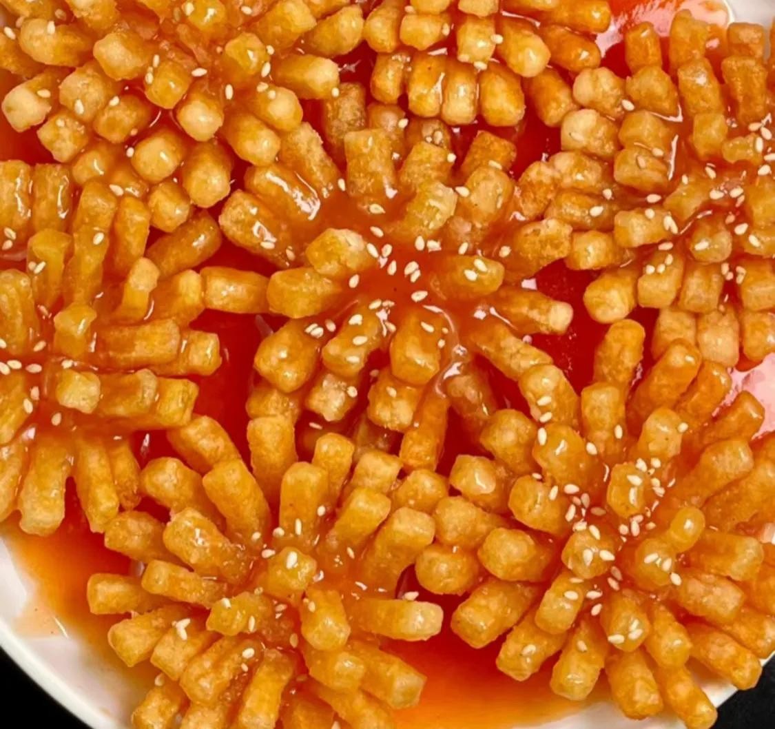 做法:将土豆用刀横竖均匀切块,底部不完全切断,然后裹上淀粉,起锅烧热油,把土豆炸至金黄后捞出备用,把番茄酱、白醋、白糖和生抽调成汁淋在土豆上,再撒上熟芝麻,就可以了。