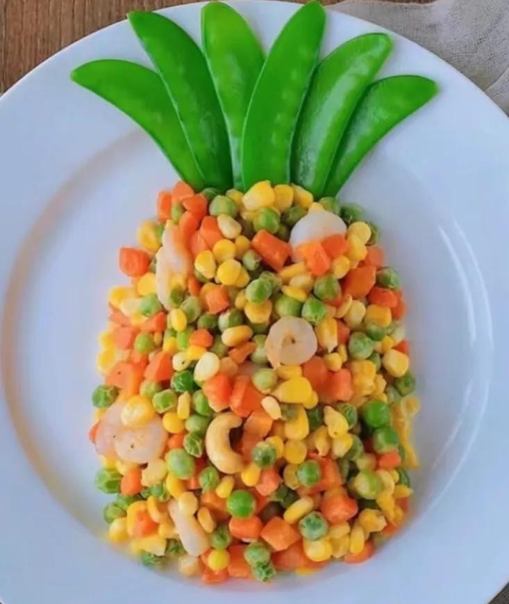 做法:虾仁加盐、料酒黑胡椒腌制几分钟备用,玉米粒、葫芦卜丁、豌豆焯水捞出备用,荷兰豆煮熟备用,起锅烧油炒熟虾仁,和玉米粒、胡萝卜丁、豌豆混合均匀,然后加盐和蚝油调味,一起放入盘中,顶部放荷兰豆就可以摆成一个彩色菠萝的形状。