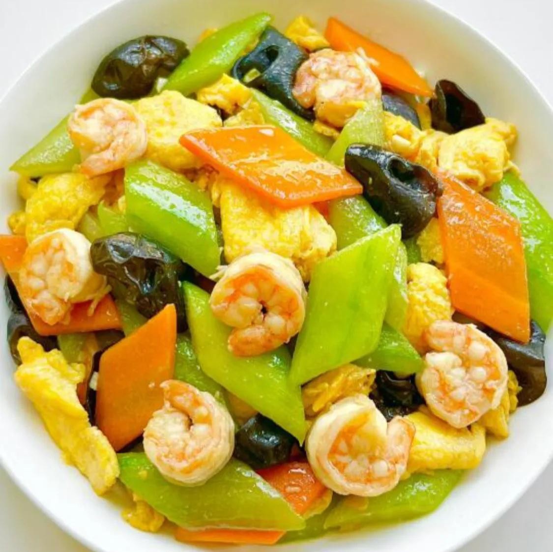 食材:虾仁,鸡蛋、黄瓜、胡萝卜、黑木耳、蒜
