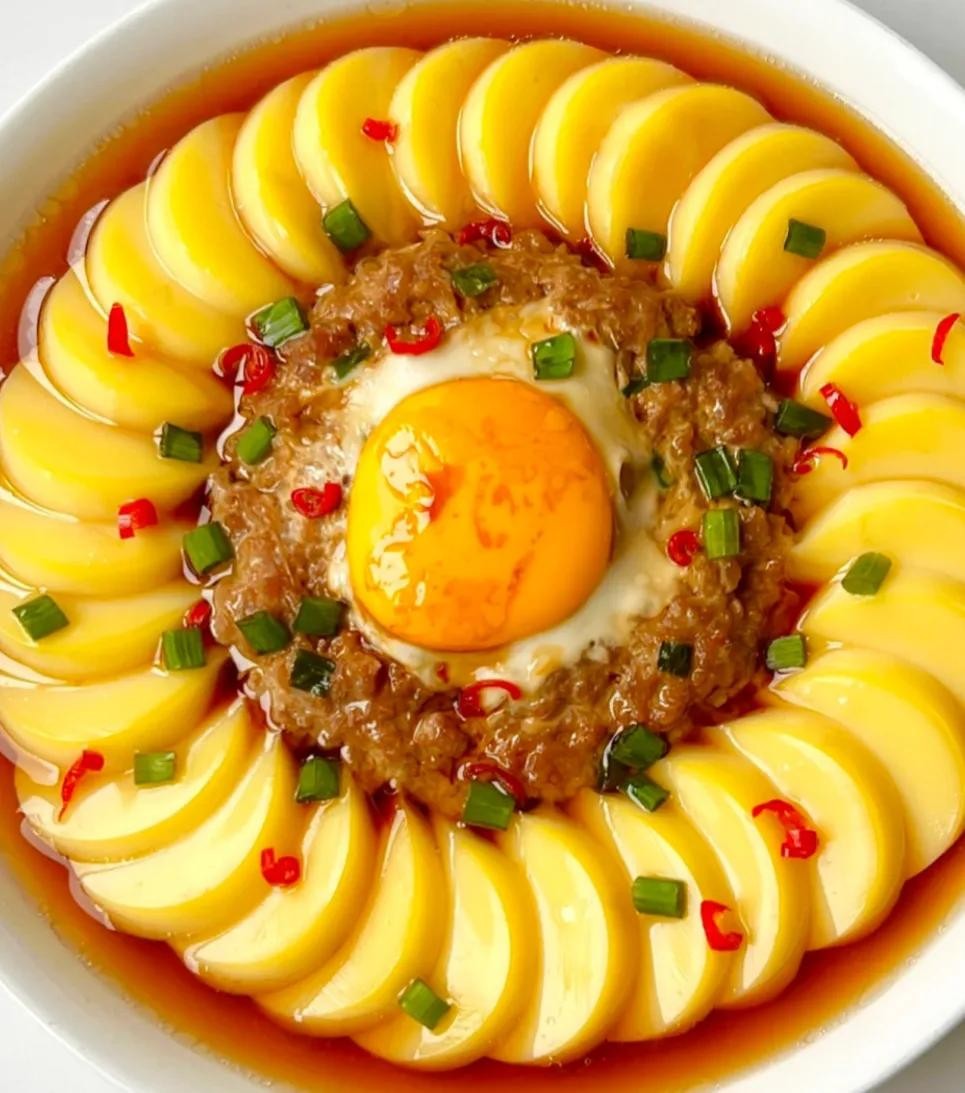 做法:猪肉沫里放姜粒、葱花、1勺生抽和料酒、半少蚝油和淀粉、几滴香油和1勺温水,混合均匀后备用,豆腐切片摆在最外面,往里倒肉沫,中间打一个鸡蛋,然后放在锅里蒸,蒸熟后放香油和碎辣椒就可以了。