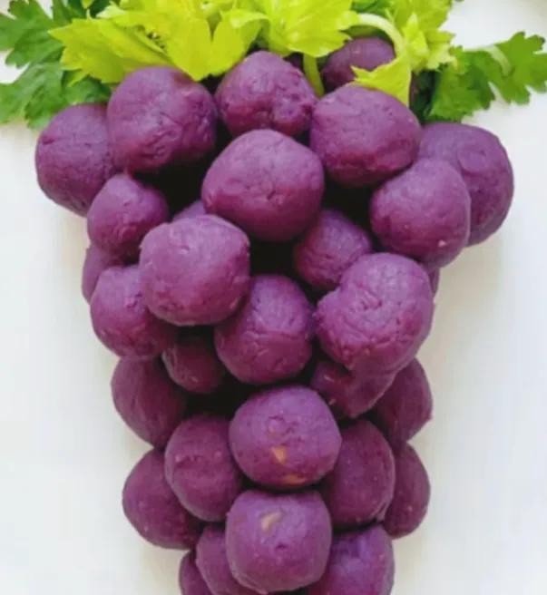 做法:把紫薯切片上锅蒸熟后捣成泥,然后戳成圆球形,在盘子里摆成葡萄形状,撒些蜂蜜,再用芹菜叶子点缀就可以了。