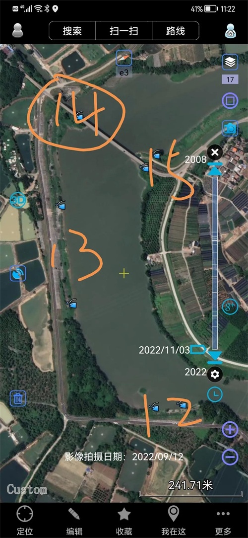12,13,14,15,号钓位的定位寻找方法如下图,以14号钓位为坐标,14是靠近三水区范湖的“古云桥”地图可以搜索到,对岸是15号,旁边依次对照地图寻找!