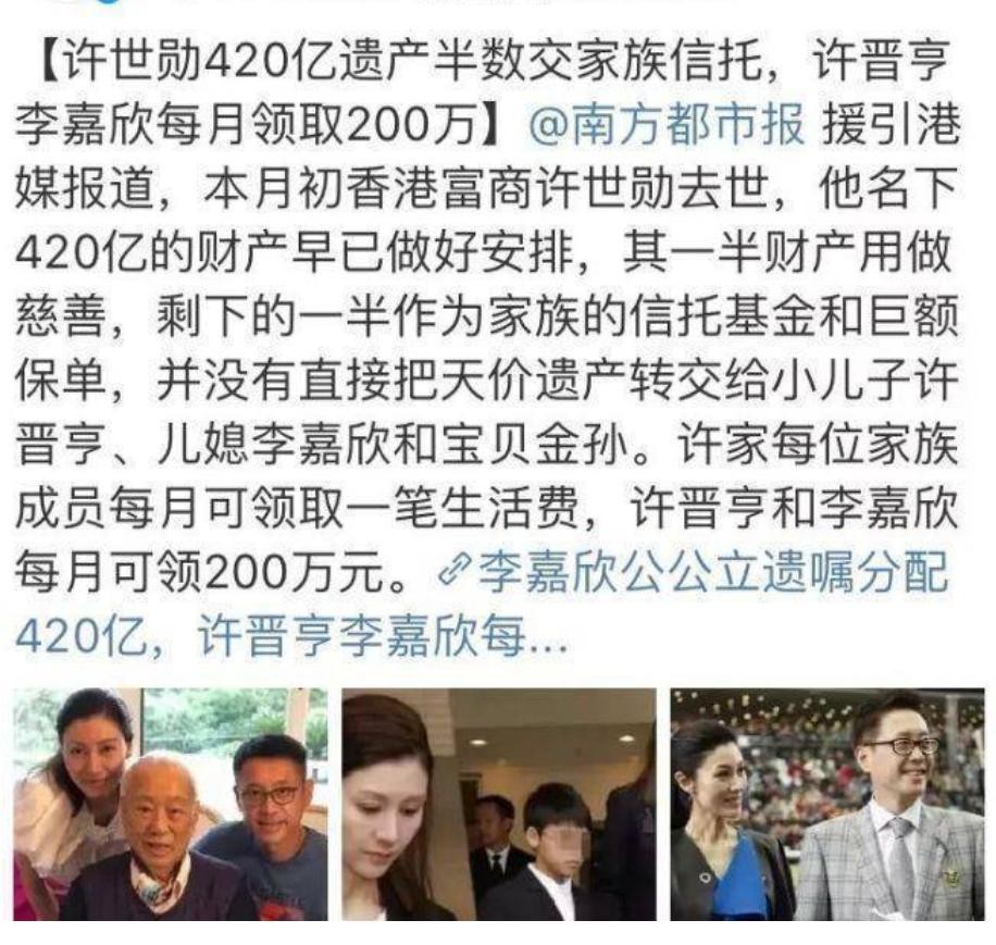 但是他没有把所有的钱给唯一的儿子许晋亨,而是办理了家族信托基金,许晋亨和李嘉欣夫妇每月可以领取200万港币,约160万人民币。