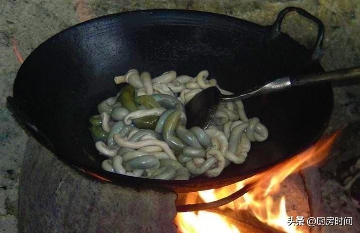 然后,就是炒羊肠,羊肠不切就这样直接炒,炒得差不多的时候,将汤底倒入进行煮制,煮的时候,一般还会再放入切碎的羊肺、羊肝、羊肚一起煮,充分煮到成熟后,就可以盛到碗里吃了,煮这种羊瘪汤,也可以在煮的时候放入八角、香叶、桂皮等香料调味,不过,更多人喜欢喝原味的,也就是只放盐调味即可。