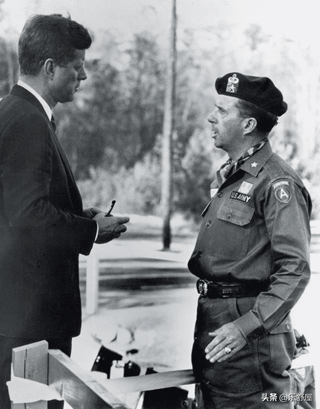 1961年10月12日,時任美国总统肯尼迪视察布拉格堡基地,与当时的陆军特种作战中心司令官威廉·雅伯罗准将交谈