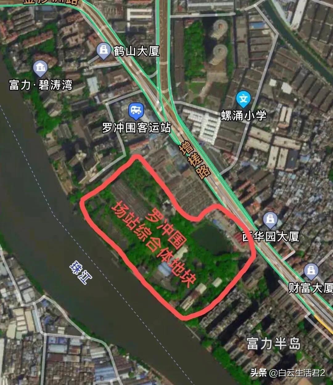 这个地块紧挨着金广电小区以及富力半岛花园,向北一直延续到罗冲围客运站。地块内现在正在兴建广州地铁13号线二期的罗冲围地铁站,与中标文件的“场站综合体”不谋而合。