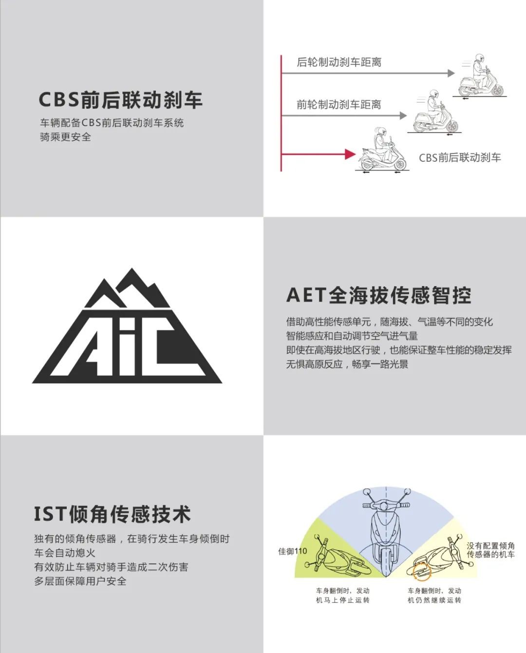 配备CBS联动刹车,海拔传感控制,倾倒熄火等功能。