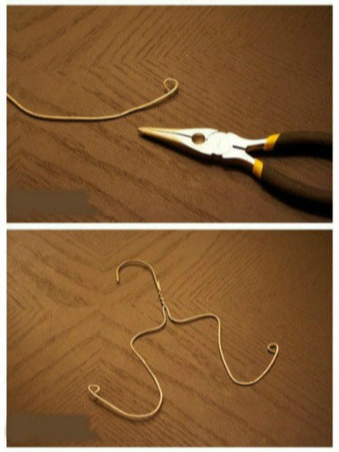 Step 3:如图,用镊子把衣架两边修成好看的圆圈,再把两边向中间合拢并勾起弧形。