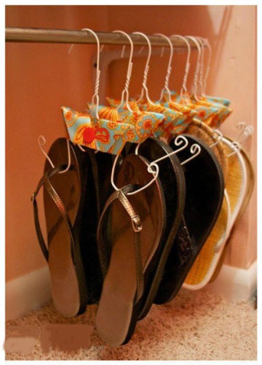 Step 6:给所有架子套上新衣后,一个个挂在门旁低矮的横杆上(或自行安装横杆),再把所有待穿的鞋子一对对挂好,这样超简约有型的鞋架就完成啦 ^_^