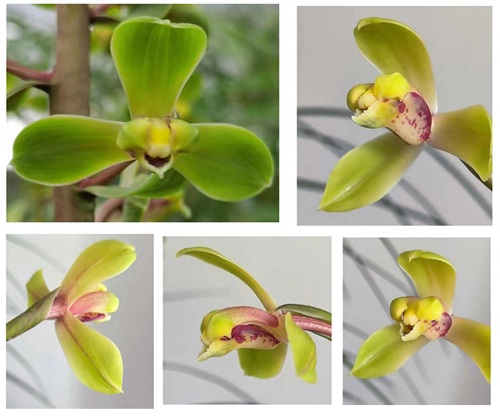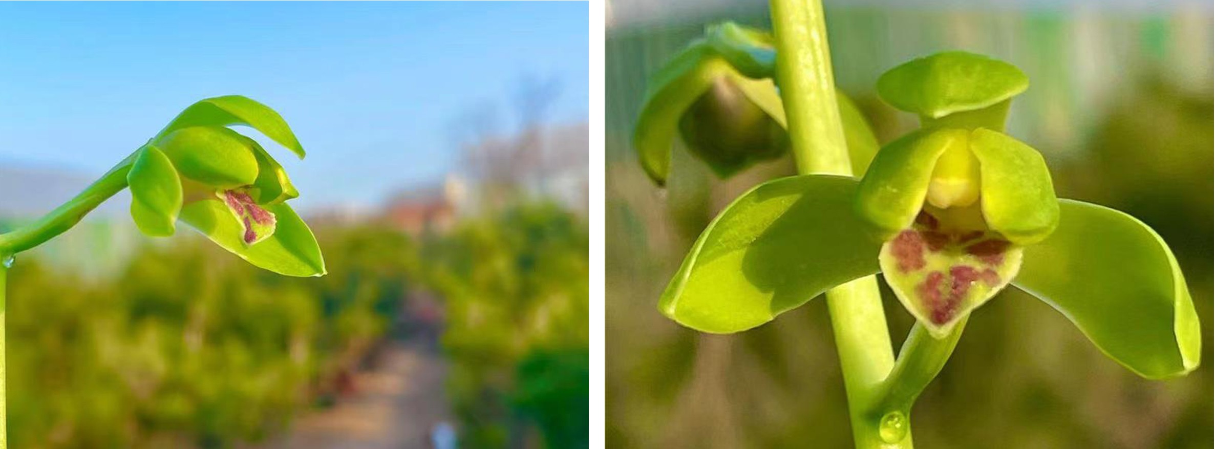 花苞为赤麻壳,花梗粗,梗绿色有红晕,出架。一梗着花7-9朵,花外三瓣短阔圆头紧边,厚糯,花色由赤转绿。捧瓣是半硬蚕蛾捧,舌为尖如意仰舌。