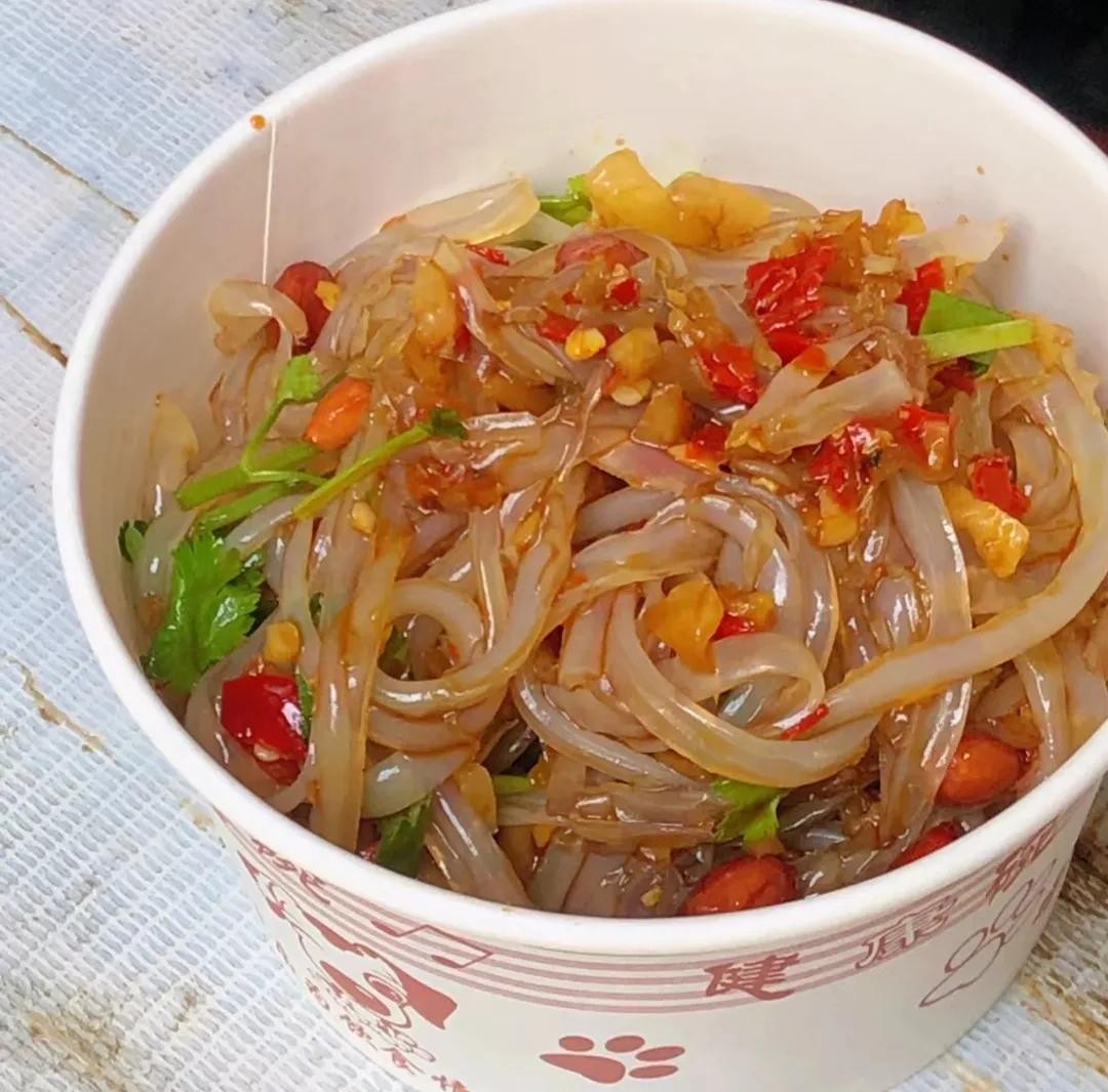 长沙的传统小吃之一,通常将凉粉切成细条,加入辣椒油、酱油、醋、蒜泥、葱花等调料拌匀。口感爽滑,味道酸辣可口,是夏季消暑的佳品。