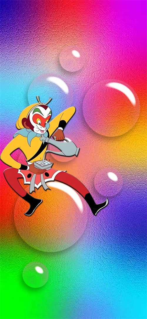 下面这张壁纸,福图一刻在七彩背景上,放置了多个气泡元素,我把悟空喝酒的元素放在一个气泡上。