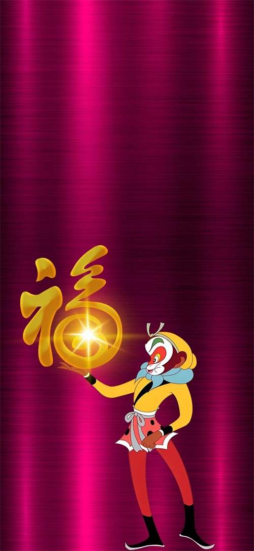 下面这张壁纸,我采用了紫红色拉丝金属背景,采用了悟空、福字、闪光等元素,共同构成悟空送福的画面。祝福粉丝朋友们事业红得发紫,福气大的比天。